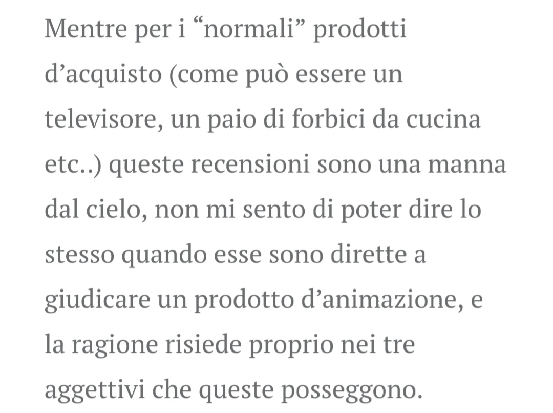 Sempre prendendo l’esempio della recensione da me menzionata: l’obbiettivo dell’autore è quello di dirigersi alle persone che non hanno visto l’opera trattata, e per questo, anche se avrebbe sicuramente potuto approfondire, semplicemente non era necessario farlo.