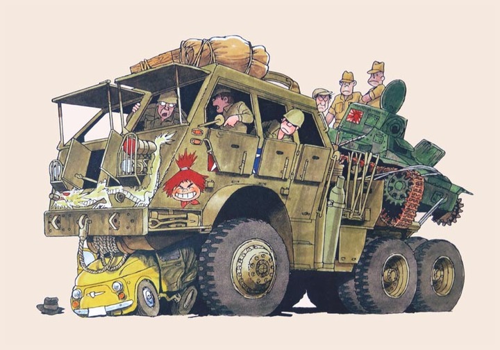 Verso la fine degli anni ’90, Otsuka fece squadra con Gainax per rilasciare un CD-ROM multimediale chiamato Yasuo Otsuka Military 4×4 Graffiti. Frutto della sua vasta conoscenza dell’argomento (Otsuka ha per anni pubblicato libri e doujinshi proprio su questo tema) e della sua collezione fotografica personale, venne fuori un’estesa presentazione di veicoli militari con tanto di “ottimi e rinomati pezzi jazz in sottofondo”. Ma in realtà questo trio composto da Otsuka, Gainax e i veicoli militari ha origini più remote.