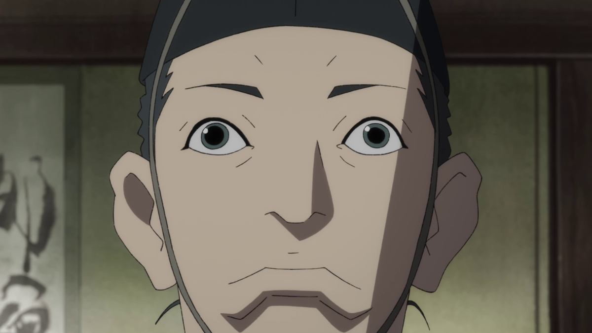 Mentre i caratteristici suoni ambientali con cui Kobayashi ci ha introdotto all’episodio continuano a rimanere in sottofondo, Dororo e il Lord del villaggio iniziano una conversazione che viene ripresa a suon di primi e primissimi piani. Se catturando il volto della prima questi ci permettono di cogliere tutta la sua umanità fatta di smorfie, pause e sorrisi, nel ritrarre gli occhi inespressivi e perennemente spalancati del secondo invece ci mettono davanti ad un uomo che ha probabilmente smesso di esser tale. La narrazione lo confermerà esplicitamente più tardi, ma lo scrupoloso focus di Kobayashi ce lo ha già ampiamente anticipato.