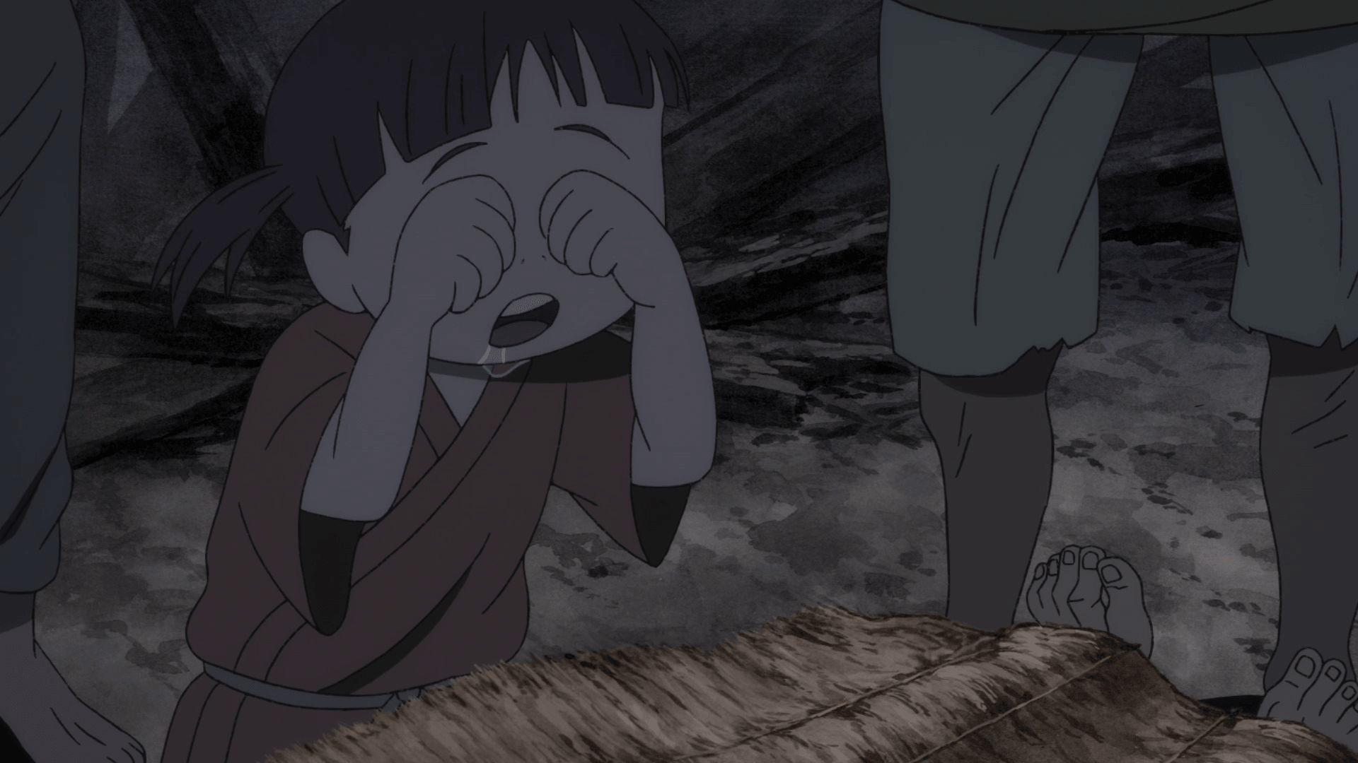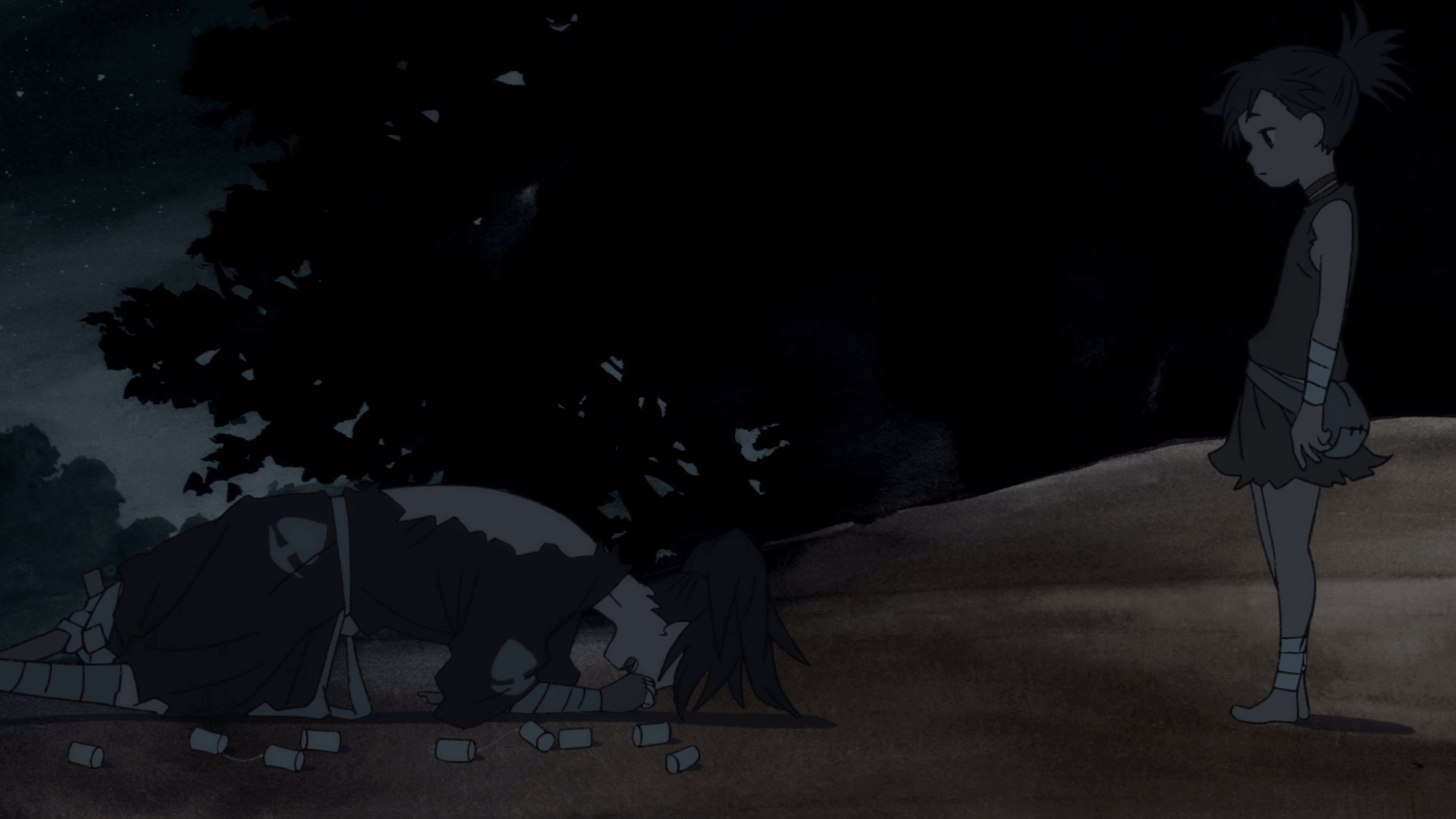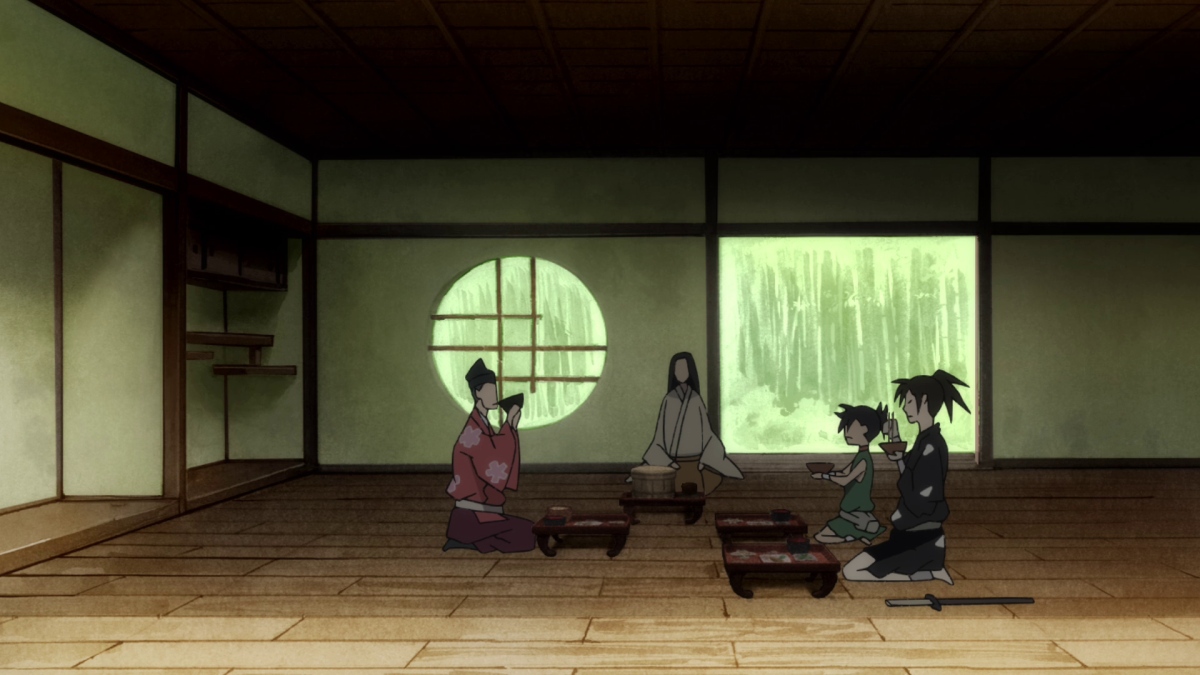 Nel frattempo, Hyakkimaru mangia con un atteggiamento simbolo del disinteresse di chi vuol soltanto portare a termine il suo compito e andarsene via. La scelta di far doppiare il rumore della masticazione del personaggio, che notiamo essere essenzialmente una distrazione dal discorso principale — oltre che un ulteriore suono in sottofondo — è tutt’altro che casuale. Per un brevissimo frangente quei rumori diventano il centro delle attenzioni della regia, creando una sensazione di estraneità ed isolamento — ergendo un muro che separa chi si vuol far coinvolgere dalla compagnia da chi invece preferisce rimanere per le sue. E tu spettatore adesso ci sei dentro, per un momento ti sei distratto anche tu.